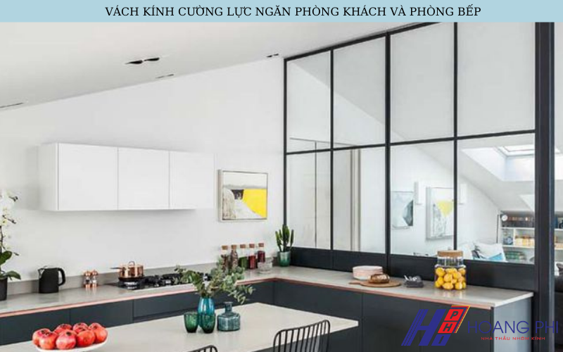 Vách kính cường lực phòng khách phân chia phòng khách với các khu vực khác trên cùng một mặt sàn như: phòng bếp, phòng đọc sách...mang lại nhiều ưu điểm và tiện lợi hơn những vách ngăn thông thường làm bằng gỗ, nhựa, thạch cao...